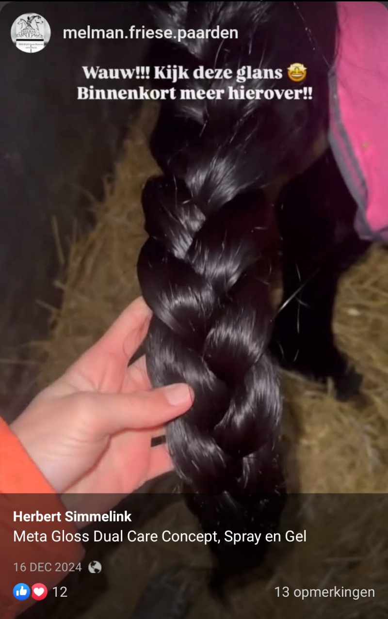 Vorig jaar kocht ik de spray en de gel en dacht eerst ja dat zeggen ze allemaal. Herbert vertelde het zo mooi.Maar hij had gelijk . Ik ben zo enthousiast geworden want het is goed door kambaar en scheelt heel veel werk want vuil stoot ook af .En bij de tinkers en onze friesepaarden gebruik ik het ook in de sokken ik wil nooit iets anders meer .ben zelfs zo verslaafd eraan dat ik het in Brabant nu zelf verkoop via Herbert ik raad het iedereen aan.HET IS JE GELD DUBBEL EN DWARS WAARD EN ZUINIG IN GEBRUIK